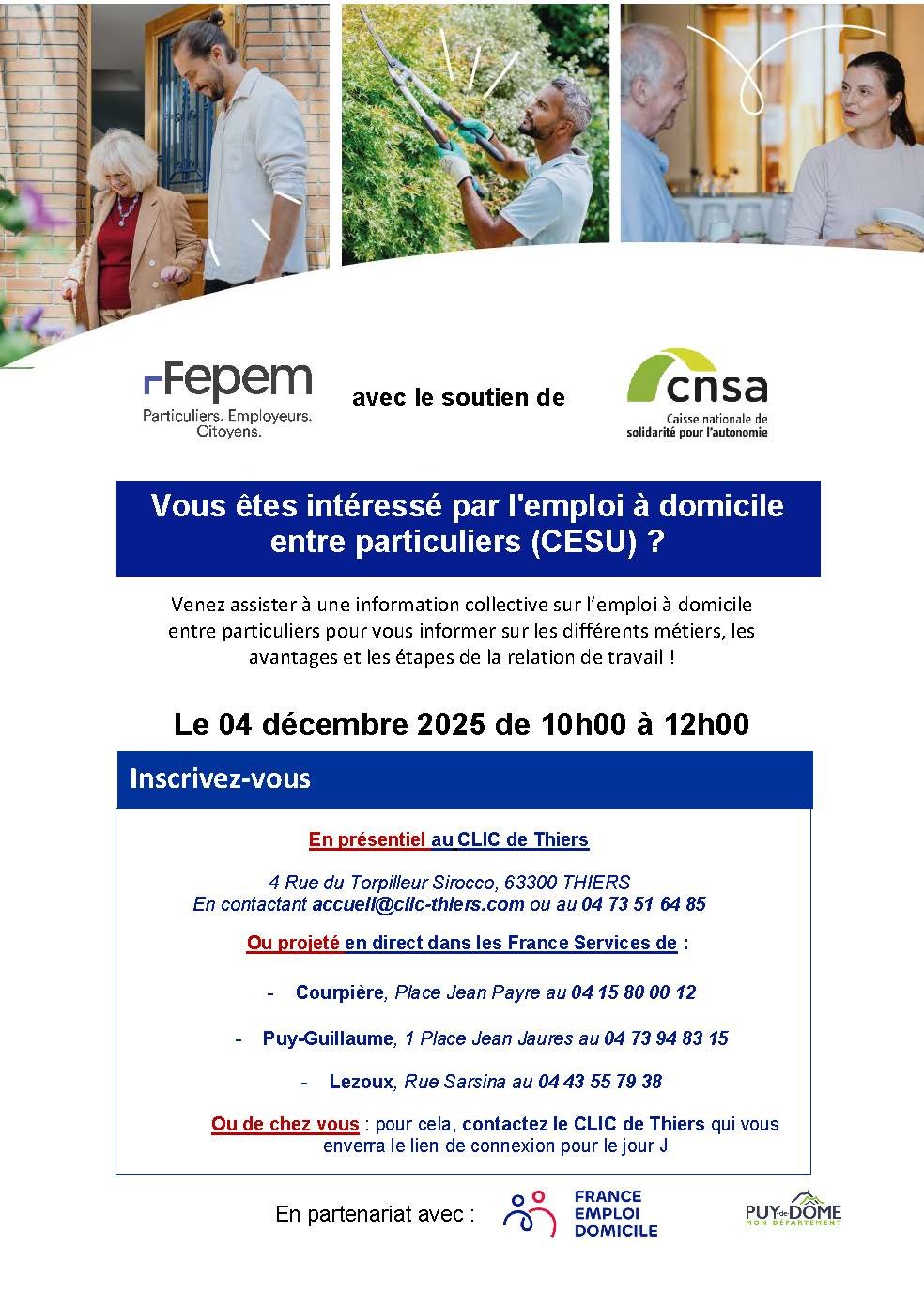 - Jeudi 4 décembre 2025 (10h à 12h). Diffusion en direct dans nos locaux de la visioconférence d’information collective sur l'emploi à domicile organisée par la FEPEM (présente physiquement au Clic de Thiers). Une occasion d’en apprendre davantage sur les particularités du CESU entre particuliers