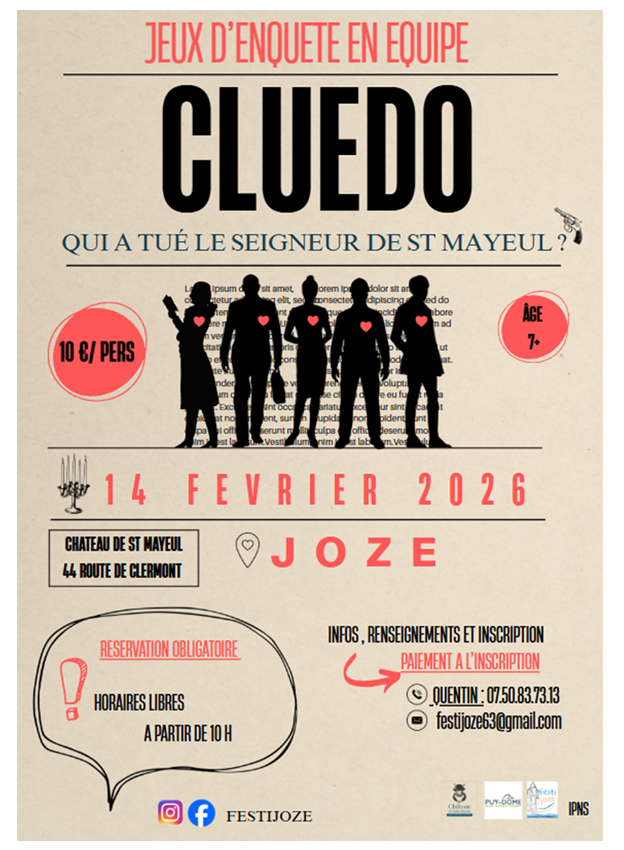 Au cœur du château de Saint-Mayeul, à Joze, l’histoire devient terrain de jeu. Les propriétaires ouvrent cinq pièces chargées de mystère, où indices et secrets se répondent. Ce Cluedo théâtralisé et romancé entraîne les participants d’un univers à l’autre. L’énigme, subtile et exigeante, se dévoile peu à peu, invitant chacun à observer, déduire et plonger dans l’âme du lieu.