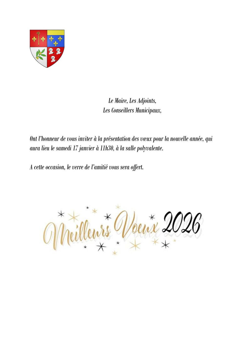 Ont l’honneur de vous inviter à la présentation des vœux pour la nouvelle année, qui aura lieu le samedi 17 janvier à 11h30, à la salle polyvalente.