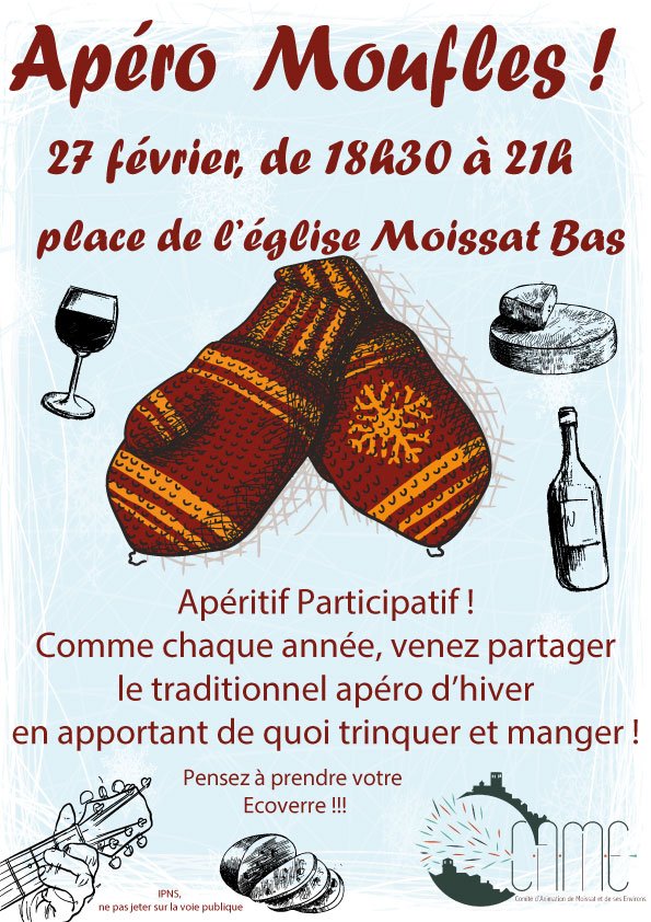 Le C.A.M.E organise son 1er apéritif Participatif le vendredi 27 Février de 18h30 à 21h place de l'église de Moissat Bas